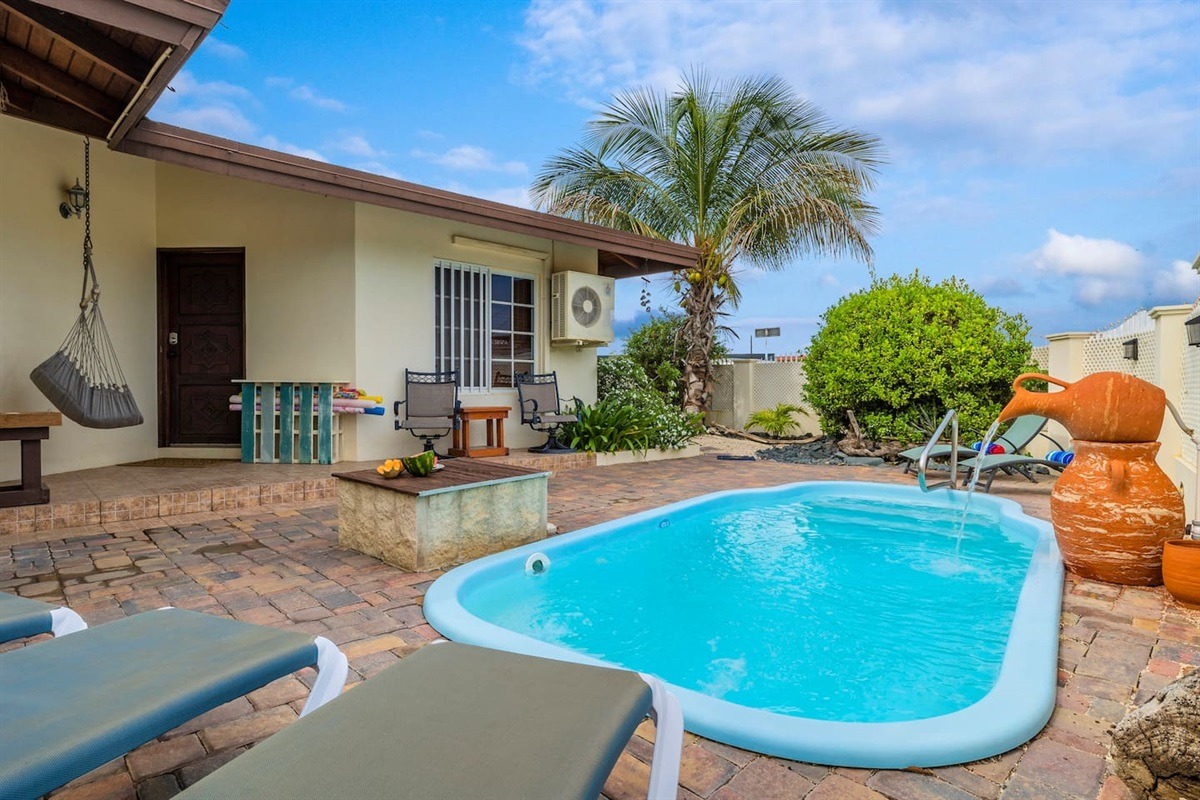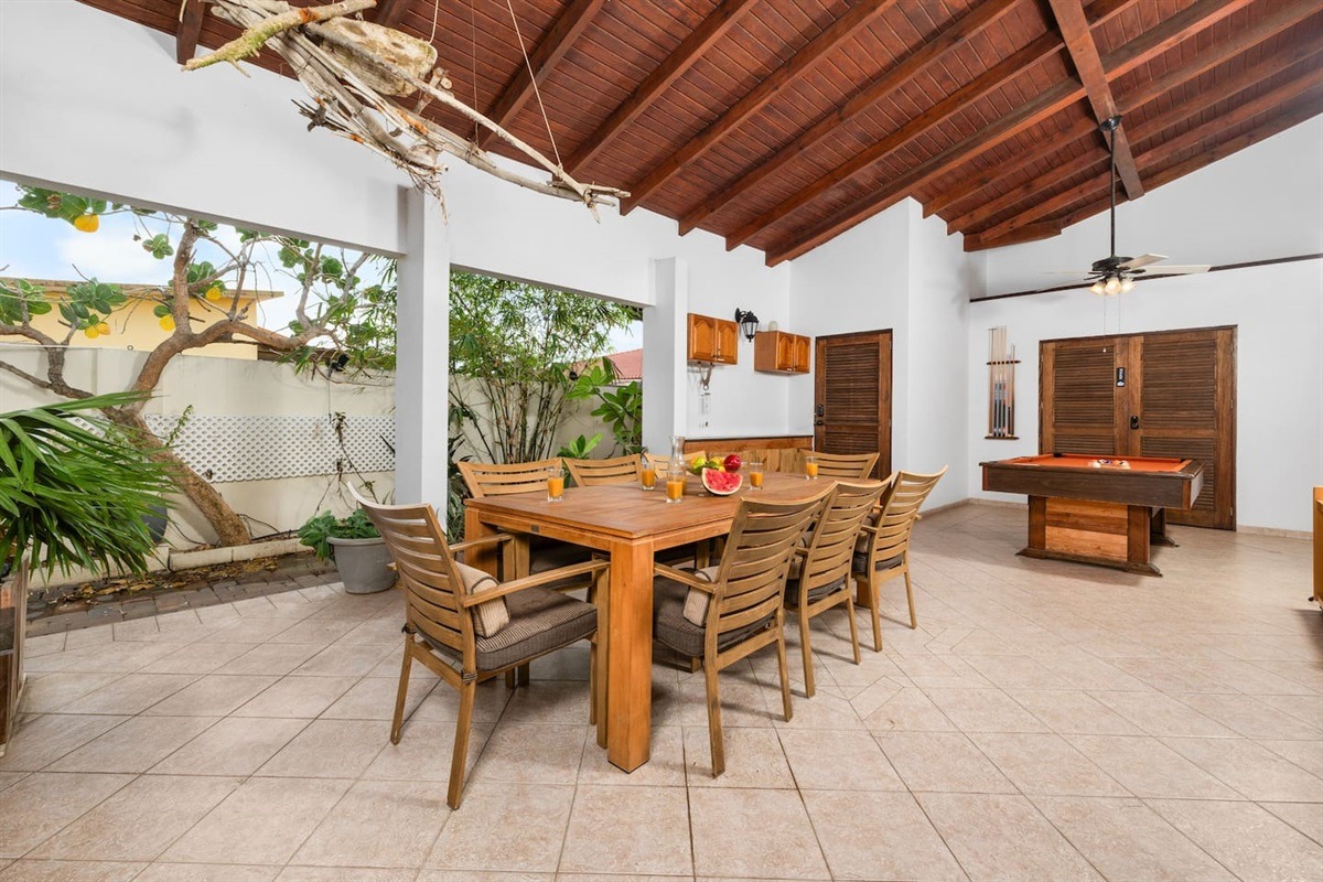 Outside, the large covered patio creates a social hub, where guests can spend entire days in the shade watching the koi fish in their pond and listening to the waterfall. In this area, there is an outdoor dining table with seating for up to 8 guests, a BBQ grill, and a pool table. Around the corner is the private pool, sun chairs, and swing, and if you walk further around you are met with beautiful fruit trees; lemons, pomegranate, mango, and banana.