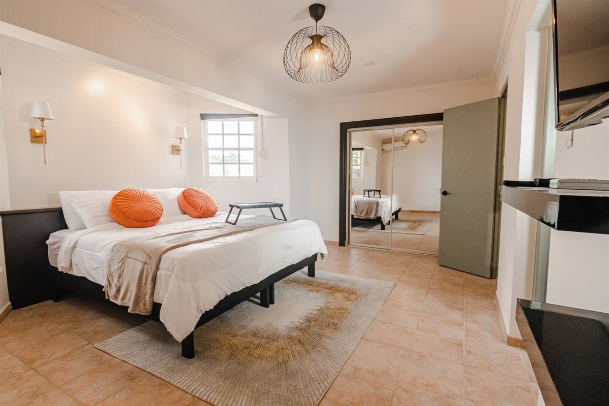 The main house has three bedrooms with comfortable beds and cable TVs. The master bedroom has a king-sized bed, huge ensuite bathroom featuring a bathtub, dual sinks, WC, shower, and a walk-in closet. The second bedroom has a queen bed and the third bedroom has two twin beds. These bedrooms have spacious closets, TVs, and share a bathroom with a basin, WC and shower.